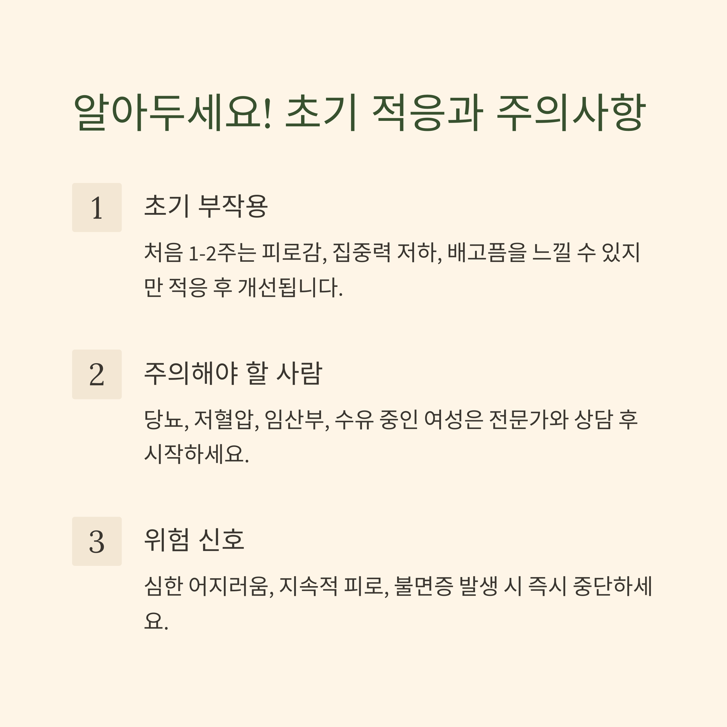 | 전문가 상담 필요 | 임신·수유부 또는 만성질환 있음 | 전문적인 도움 필요시 |