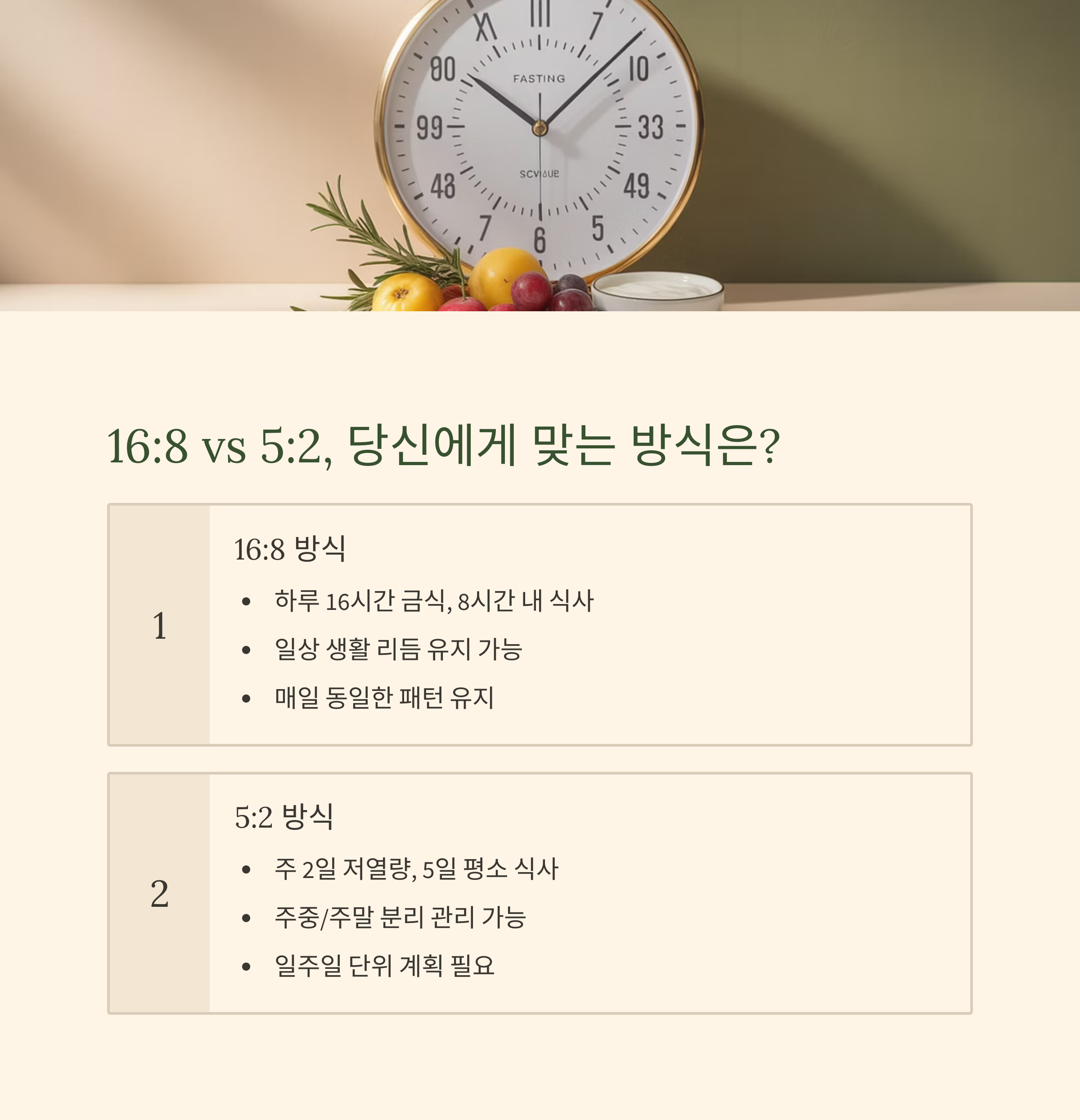 간헐적 단식에는 여러 방식이 존재하지만, 그중 16:8 방식과 5:2 방식이 대표적입니다. 📊 각각의 방식은 고유의 장단점을 가지고 있으며, 식사 패턴과 일상 생활 스타일에 맞춰 선택할 수 있습니다. 이러한 간헐적 단식의 핵심 데이터와 효과를 아래 표에서 살펴보세요.