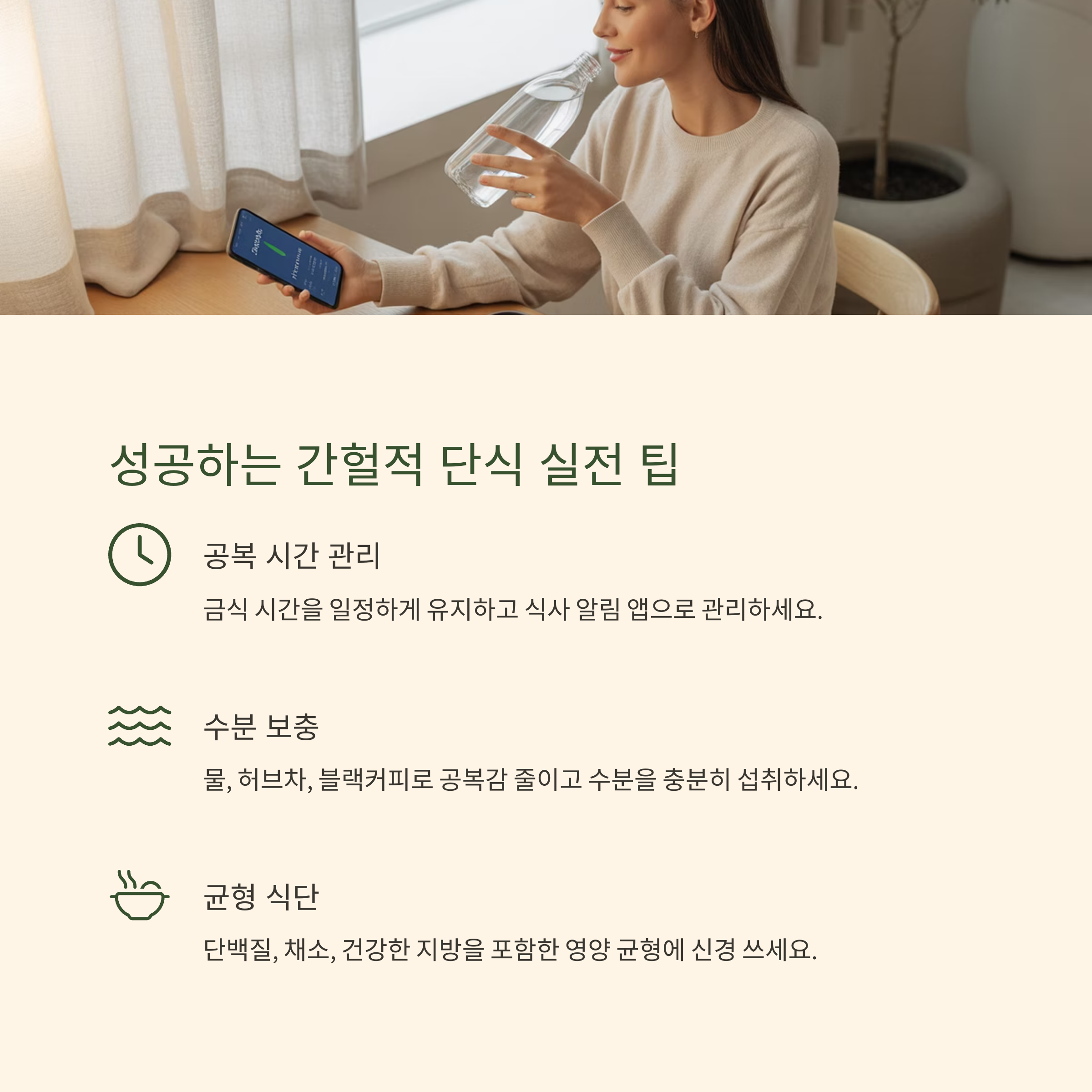 처음 시작할 때는 공복 시간에 익숙해지기 위해 충분한 수분 보충과 적절한 운동을 병행하는 것이 중요합니다. 또한 초기 피로감과 어지럼증을 대비하여 무리하지 않도록 유의해야 합니다. 무리한 식단 제한보다는 서서히 변화에 적응하도록 하며, 자신에게 맞는 방식을 찾아가는 것이 장기적인 성공의 비결입니다.