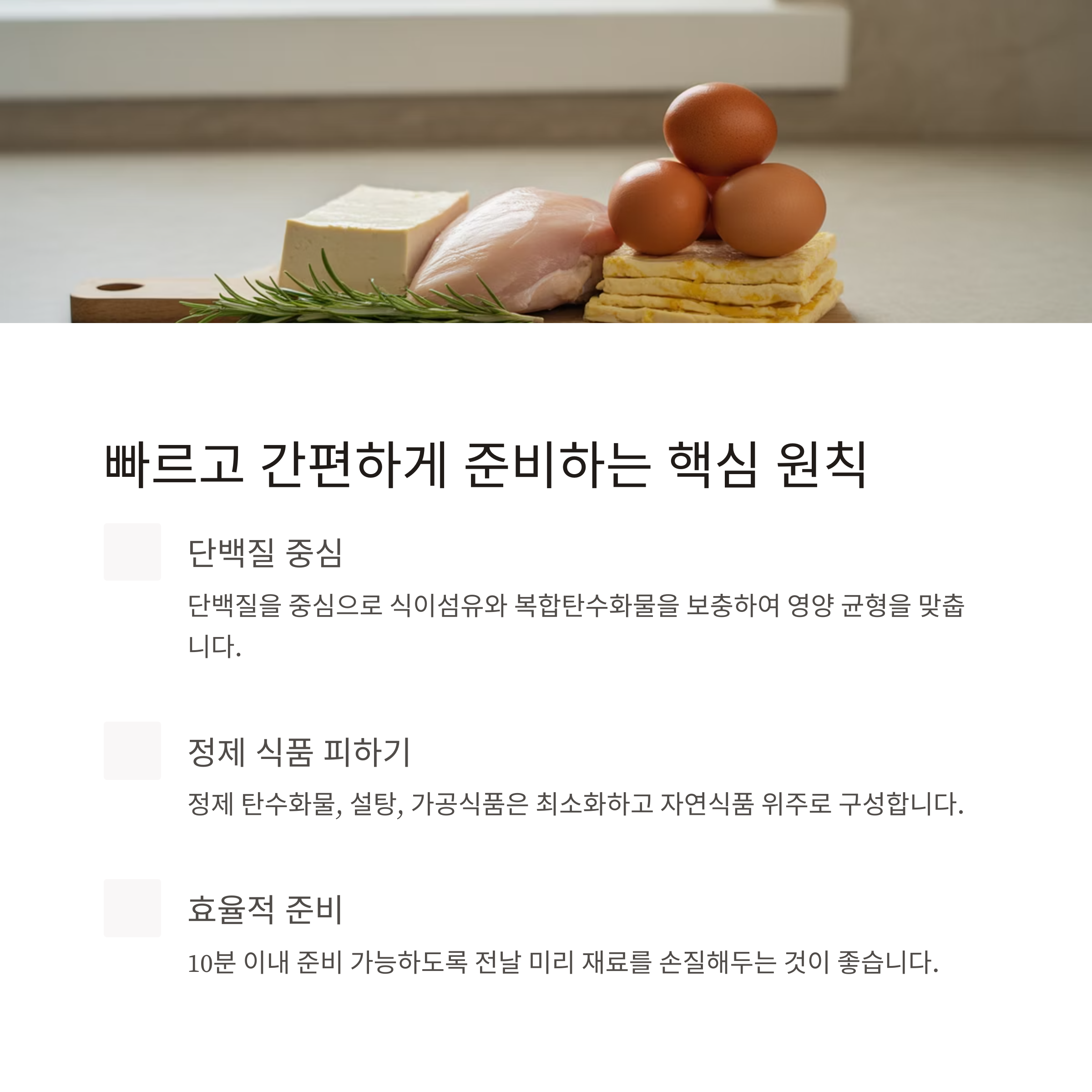 - 닭가슴살 또는 삶은 달걀 등 빠르게 조리가능한 재료를 선택하세요