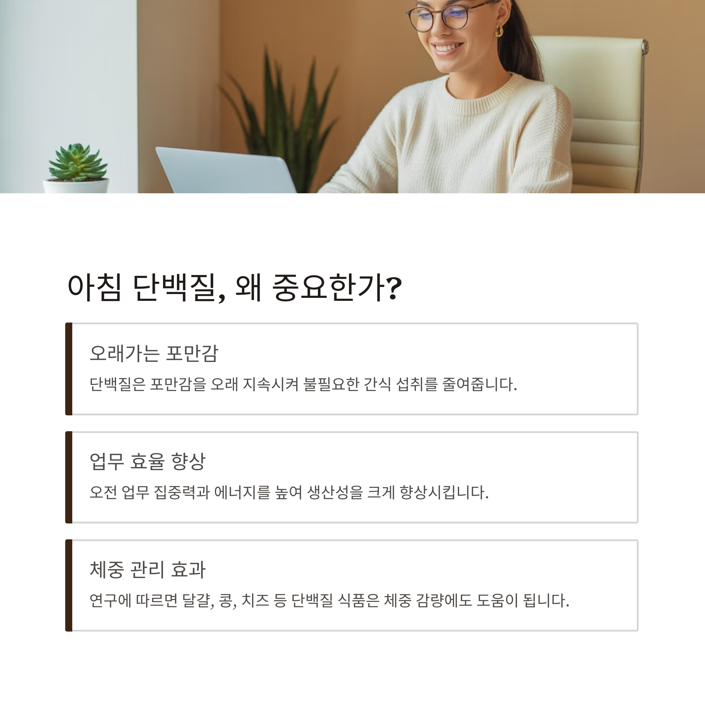 아침에 단백질을 충분히 섭취하는 것은 여러 가지 이유로 중요합니다. 첫째, 단백질은 근육 유지와 성장에 꼭 필요한 영양소로, 아침에 섭취하면 하루를 활기차게 시작하는 데 도움을 줍니다. 둘째, 단백질은 포만감을 오래 유지해 주기 때문에 불필요한 간식을 줄이는 데 효과적입니다. 마지막으로, 단백질은 대사율을 높여주어 체중 관리에도 긍정적으로 작용합니다.