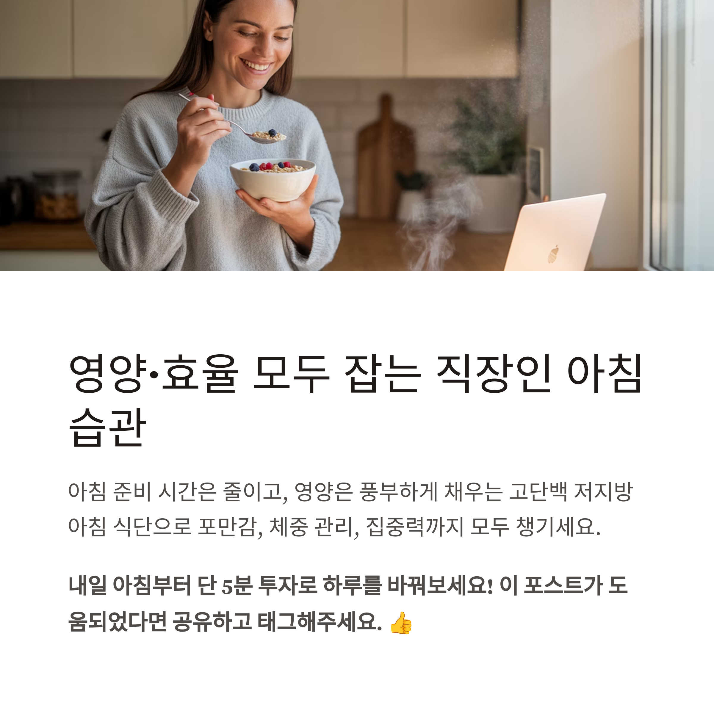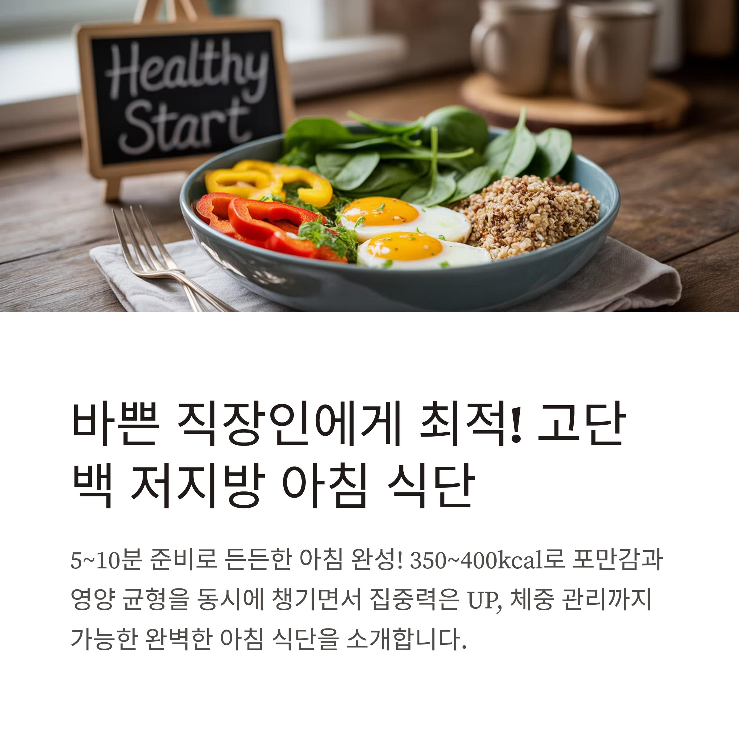 현대 직장인을 위한 고단백·저지방 아침 식단은 아침부터 건강을 챙길 수 있는 중요한 시작점입니다. 단백질 섭취를 아침에 충분히 하는 것은 하루의 시작을 활기차게 만들어줍니다. 특히 단백질 섭취가 중요하기 때문에, 아침에 20~25g의 단백질을 섭취하면 오전 내내 포만감을 제공하여 불필요한 간식을 줄일 수 있어요. 또한, 칼로리는 350~450kcal로 설정하여 에너지를 충전하면서도 과식을 피할 수 있습니다. 아침을 간단하게 준비할 수 있는 편리함은 매우 중요합니다. 5~10분 안에 준비 가능한 식단이라면 시간에 쫓기는 아침에도 쉽게 실천할 수 있습니다. 이를 위해 지속 가능한 식사 패턴을 만들어나가야 합니다. 이로써 바쁜 아침에도 건강을 유지할 수 있는 일상 습관을 만들어 나가 볼까요? 😊
