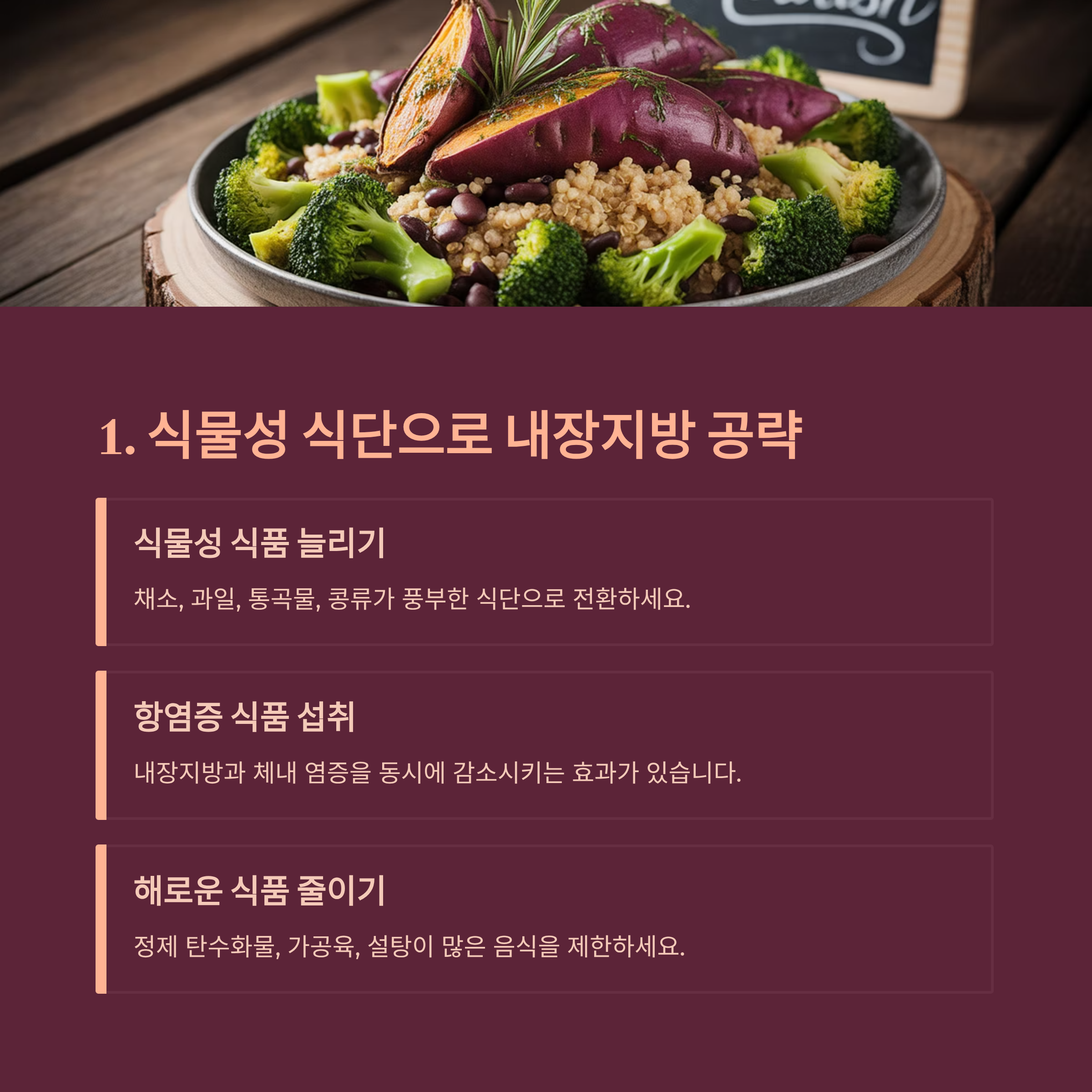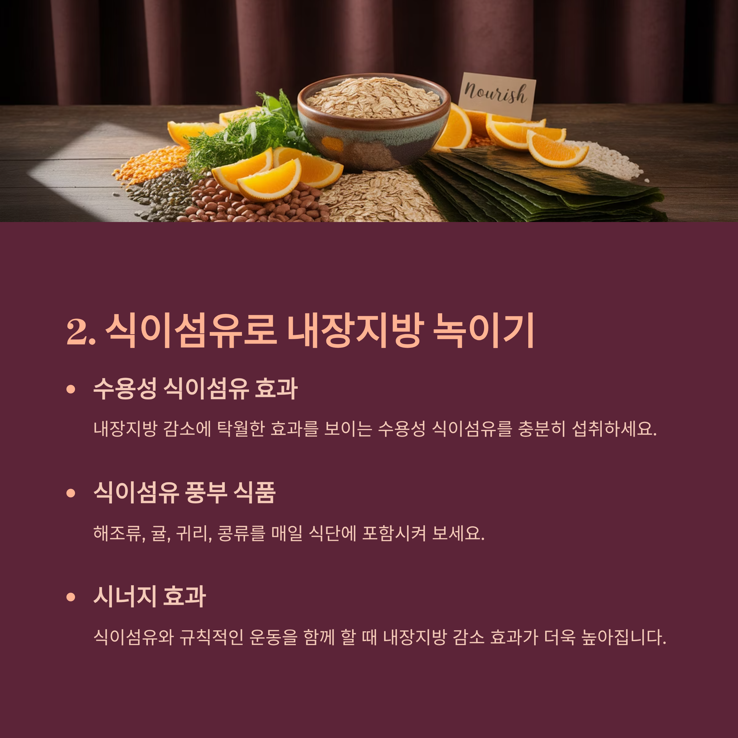 내장지방을 줄이려면 식물성 중심의 식사가 필수예요. 특히 채소, 과일, 콩류 등은 지방감소에 크게 기여하죠. 하루에 식이섬유를 30g 이상 섭취하면, 내장지방률이 평균적으로 4~5% 줄어든다고 하는데요. 와우, 놀랍지 않나요? 이건 우리가 쉽게 실천할 수 있는 부분이에요.