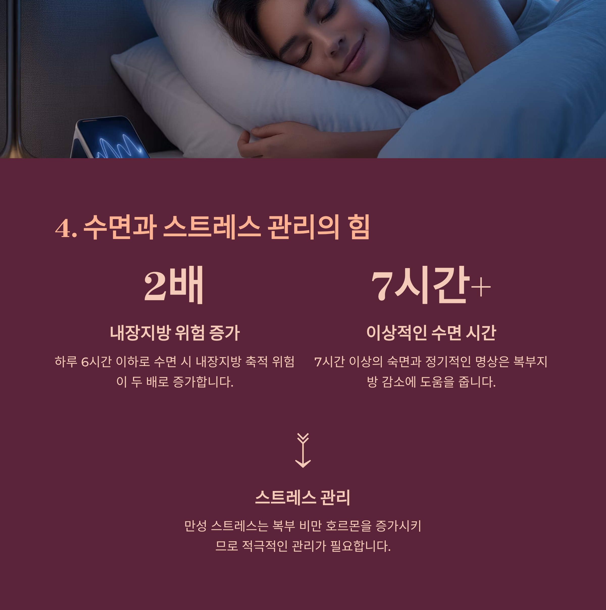 수면은 쉽게 간과되는 요소지만, 내장지방 감소에 매우 중요해요. 성인은 하루 7~8시간의 수면이 필요한데, 수면 시간이 짧아지면