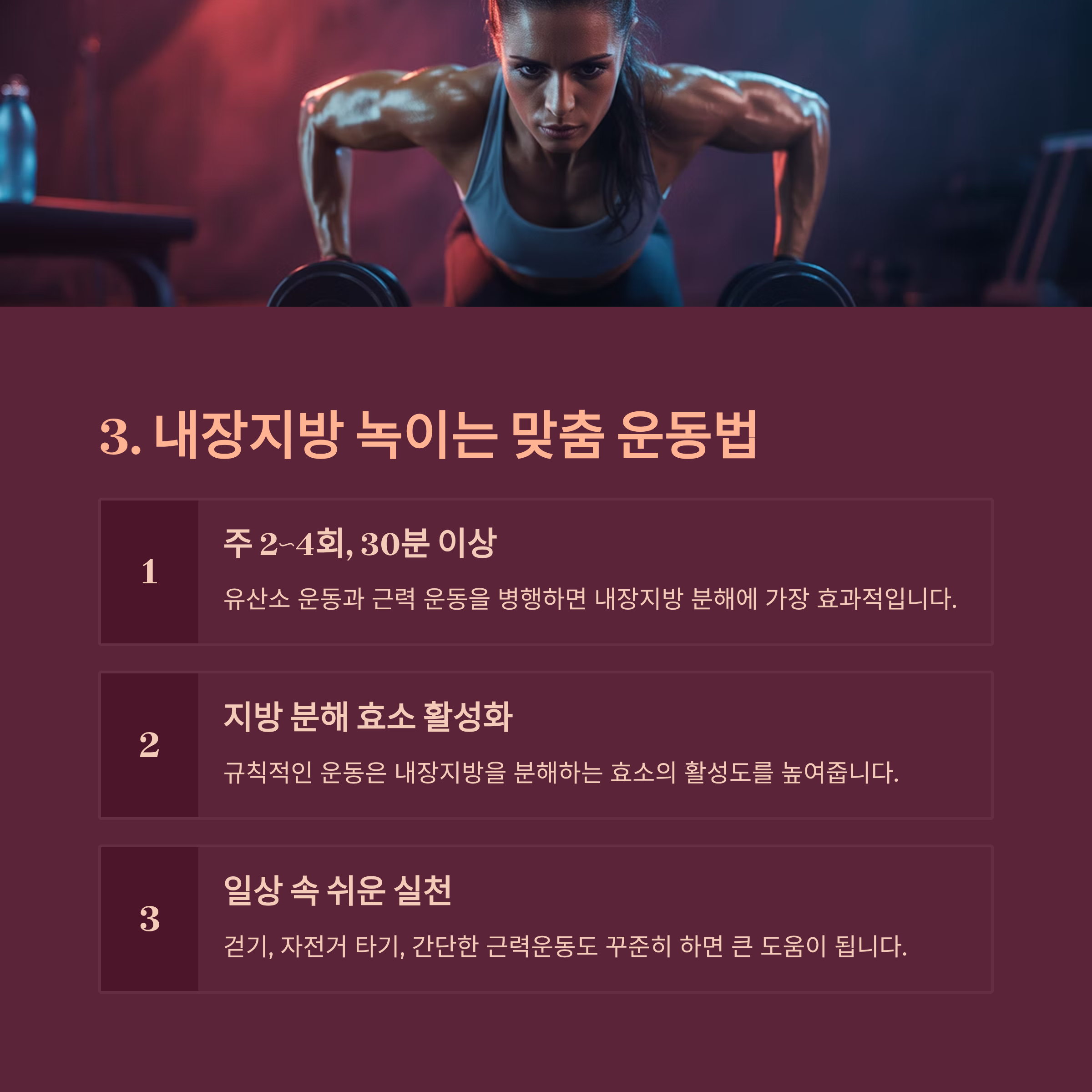 특히 고강도 인터벌 훈련은 내장지방을 줄이는 데 큰 효과가 있어요. 운동 부족자는 쉽게 내장지방이 증가할 수 있다니, 운동을 생활화 해야겠죠? 😊