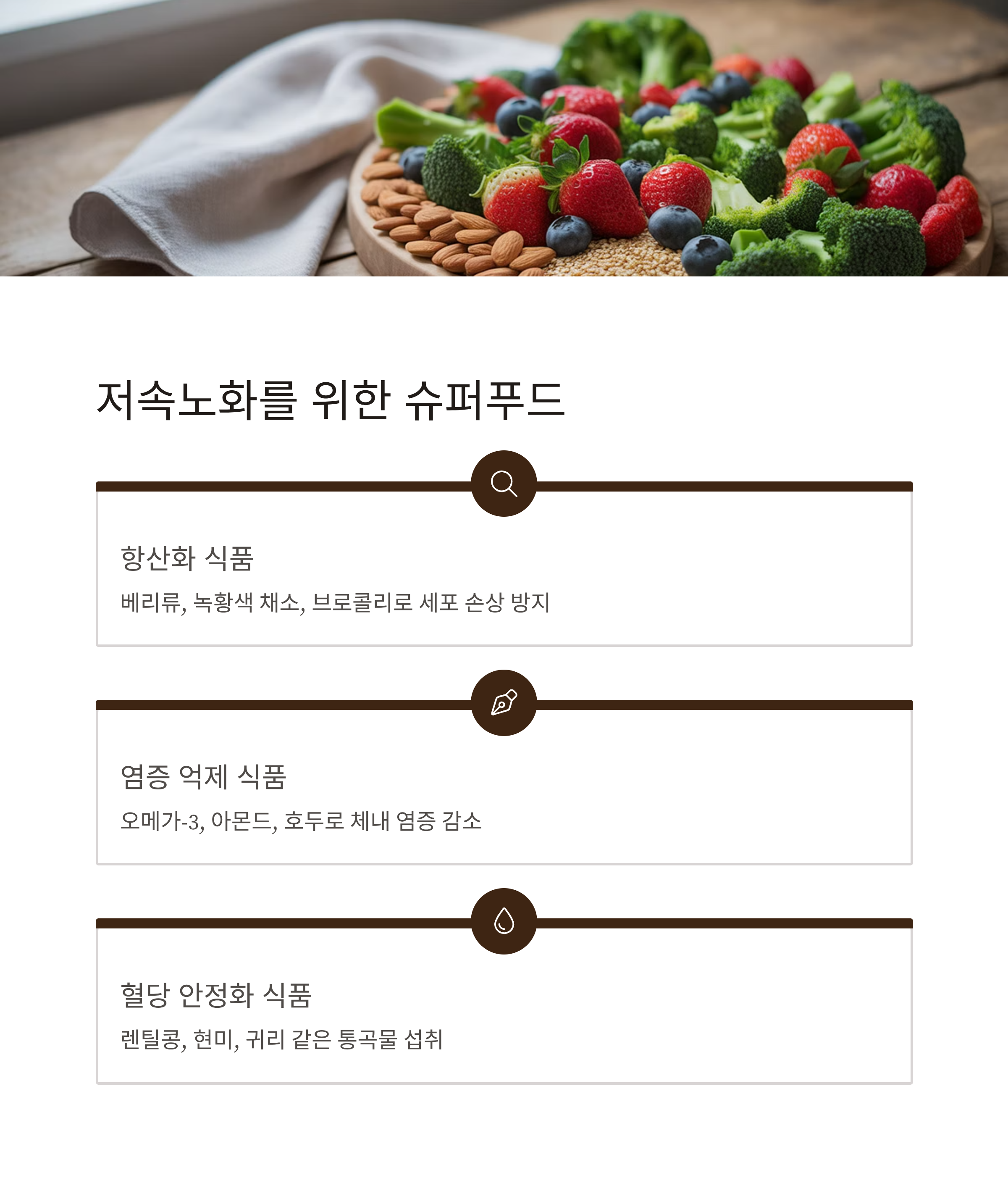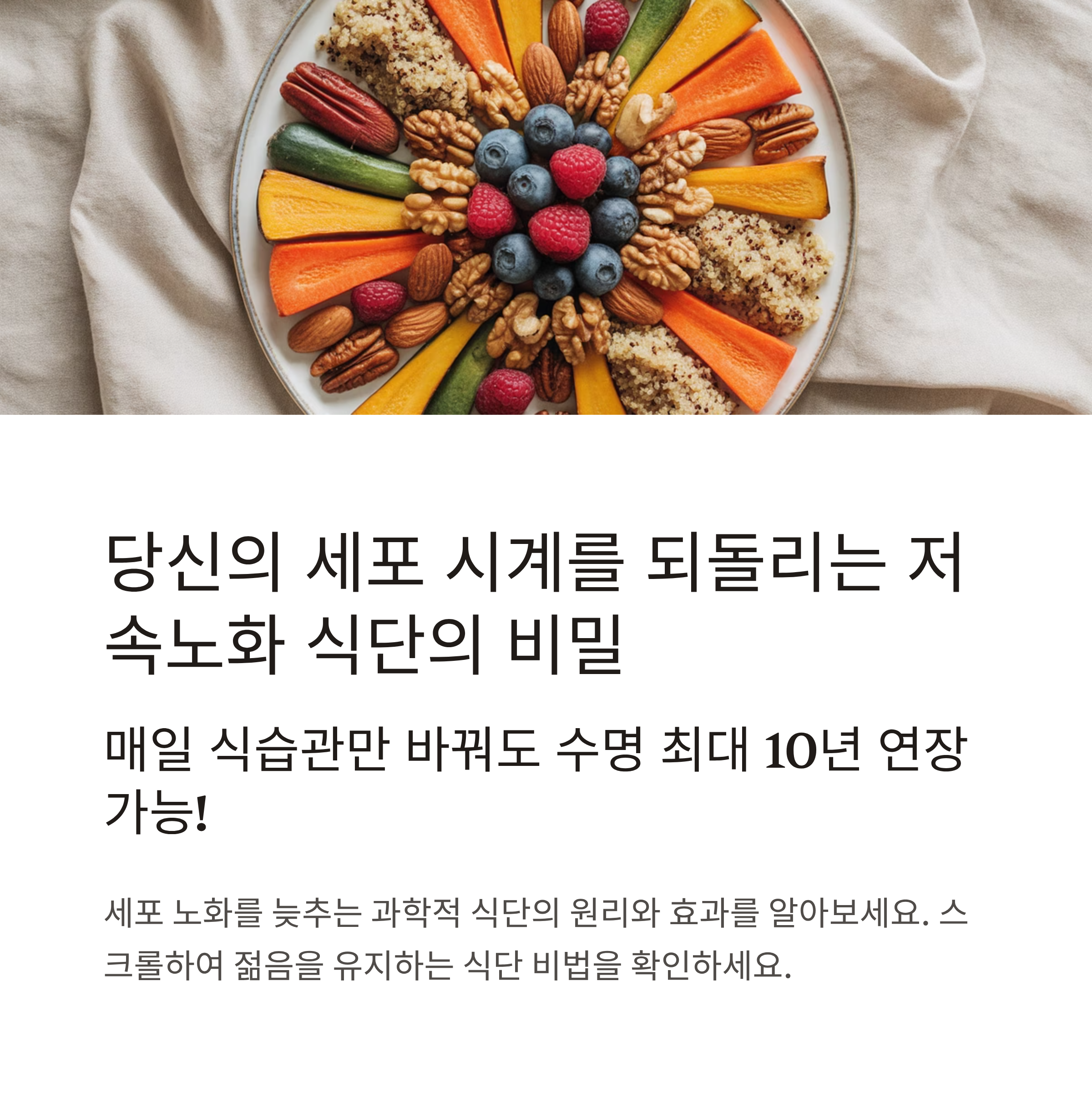 우리가 매일 섭취하는 식단은 단순한 에너지 공급뿐만 아니라, 세포 노화에 직접적인 영향을 미칠 수 있어요. 저속노화 식단은 주로 항산화, 염증 억제, 혈당 안정, 그리고 자가포식 유도의 네 가지 원리를 기반으로 합니다. 항산화를 위해 각종 베리류나 녹황색 채소를 섭취하면 활성산소로 인한 세포 손상을 막을 수 있죠. 또한 오메가-3 지방산이 풍부한 식품은 염증을 억제하는데 훌륭합니다. 혈당 관리는 인슐린 저항을 예방하는 데 중요하며, 통곡물과 식이섬유가 풍부한 음식을 권장합니다. 마지막으로, 자가포식을 통한 세포 회복은 칼로리 제한과 간헐적 단식을 통해 가능하답니다. 이런 식단 구성 방식은 간단해 보여도 우리 몸의 세포 건강을 유지하는 데 큰 역할을 하게 되어요.
