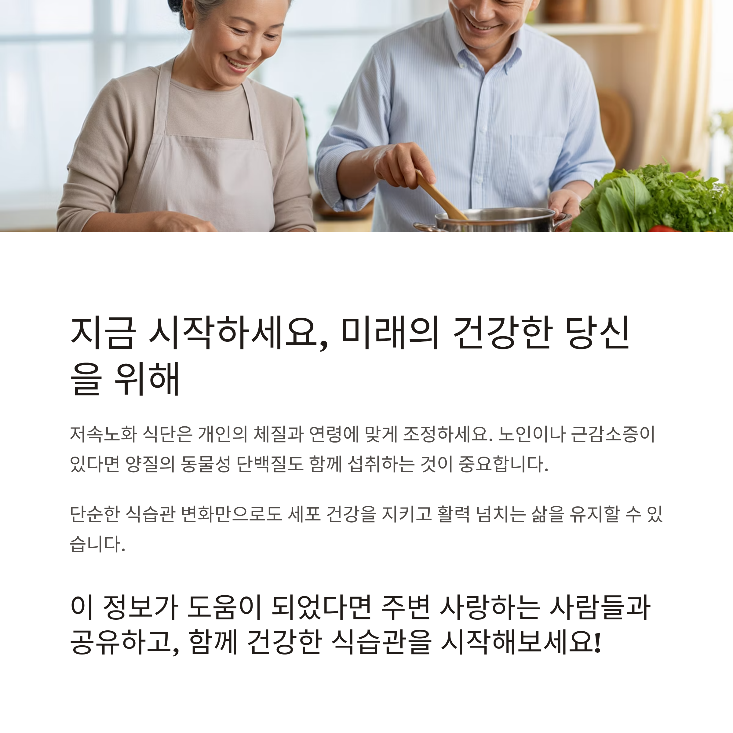 저속노화 식단은 항산화, 항염증, 자가포식을 중심으로 세포 건강을 개선하고 질병 예방에 크게 기여할 수 있습니다. 규칙적인 식사 관리와 영양소 섭취를 통해 건강을 유지하고, 생활습관 개선을 통해 삶의 질을 높이는 전략입니다. 오늘부터 🌿 실천해보시면 무척 유용하실 거예요. 이를 통해 더 건강하고 활기찬 삶을 영위할 수 있게 되기를 기대합니다! 🎉