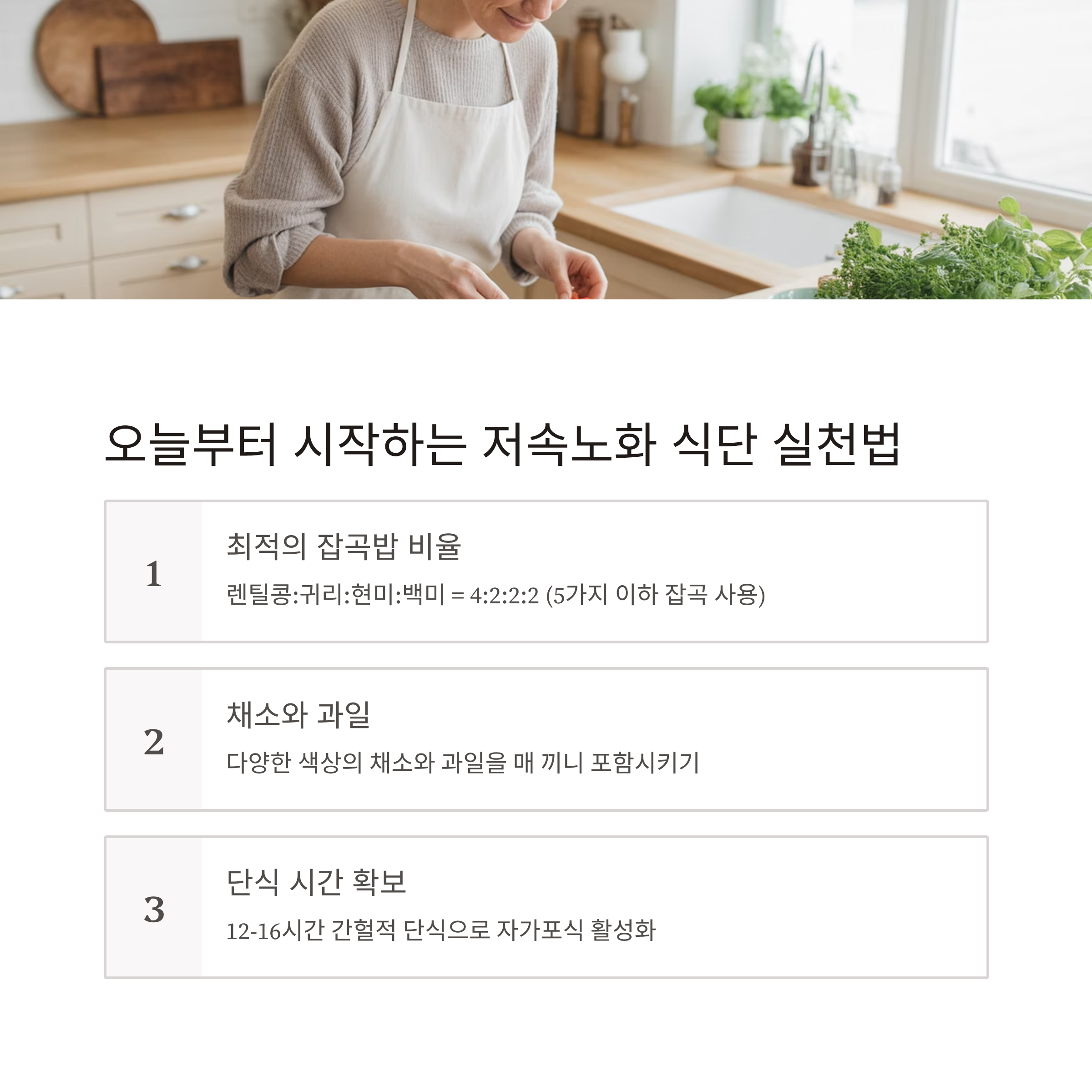저속노화 식단은 단순히 식사의 구조를 변화시키는 것 이상으로 생활의 질을 크게 향상시킬 수 있는 방법입니다. 세포 수준에서의 항산화 및 염증 억제 효과를 통해 만성 질환의 위험을 줄이며, 간헐적 단식은 체내 회복력을 높이는 데 도움이 됩니다. 이러한 식단을 효과적으로 적용하기 위해, 아래의 체크리스트를 참고하세요.