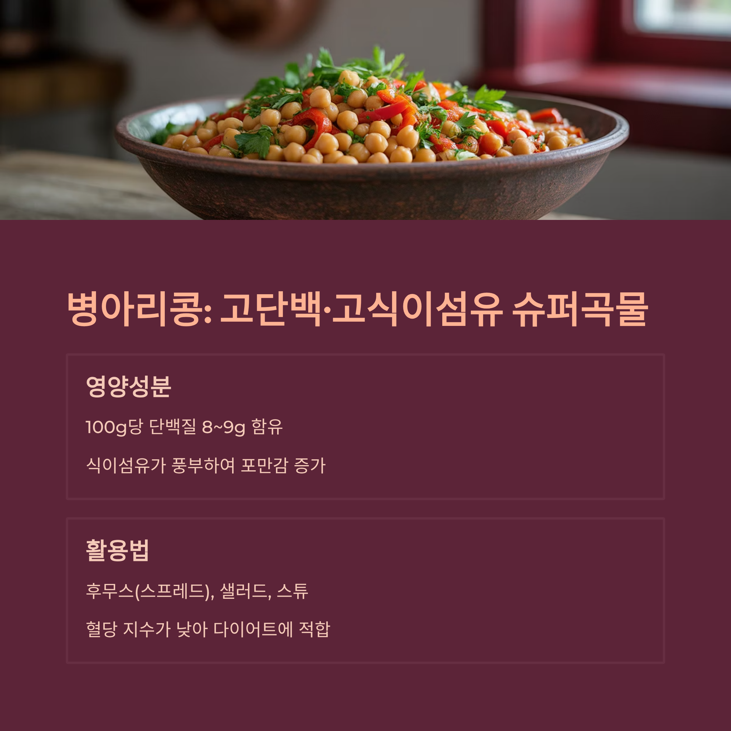 병아리콩은 단백질 함량이 높아서 영양가가 아주 뛰어난 식재료랍니다.