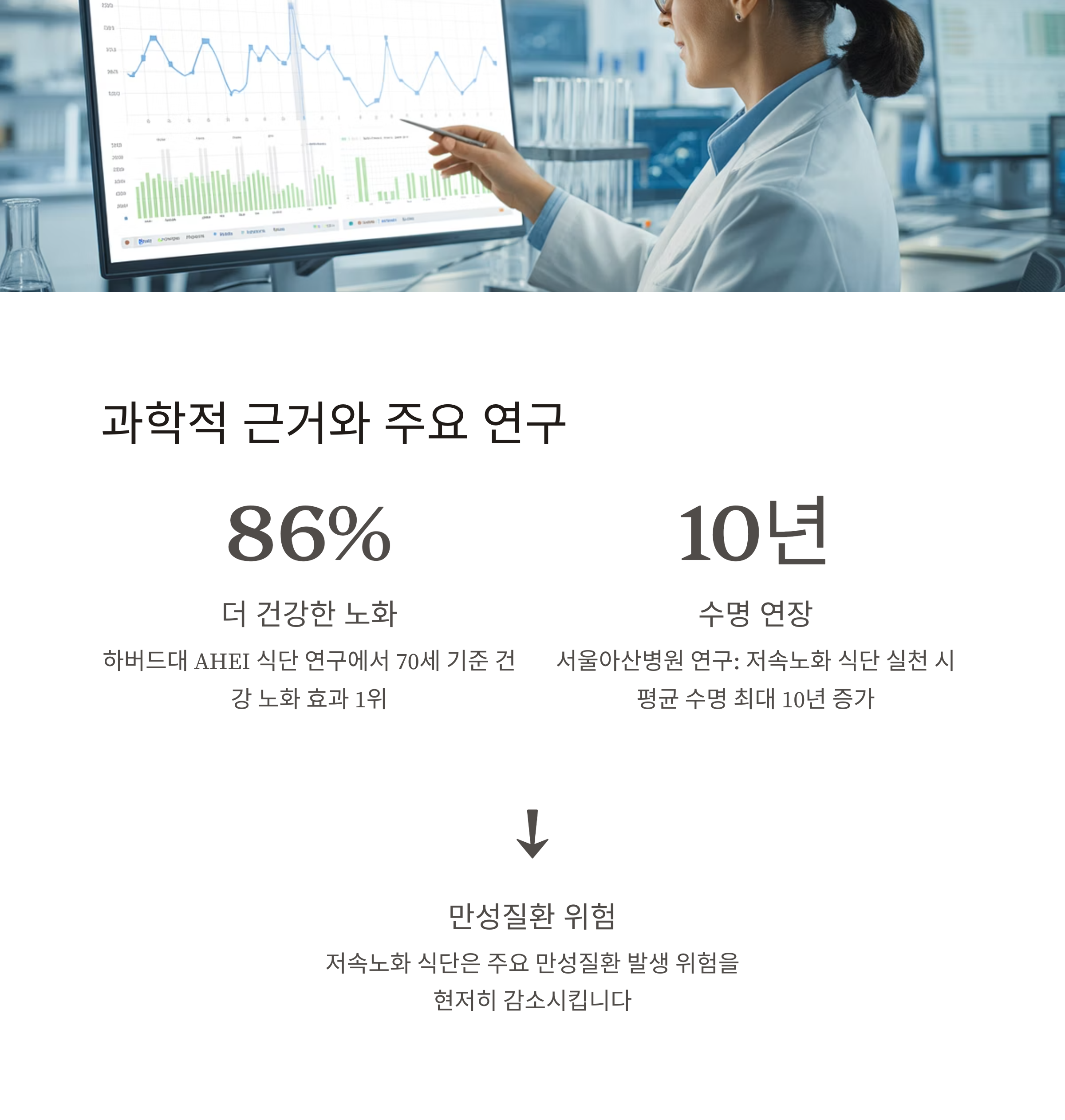 저속노화 식단은 과학적 연구와 실증 데이터를 통해 그 효과를 입증받고 있습니다. 실제로 하버드 대학에서는 70대 이상의 참가자를 대상으로 한 장기 추적 연구를 통해, 철저한 식단관리를 실천한 그룹에서 주요 만성질환의 발생률이 38% 감소했다는 결과를 내놓았습니다. 🙌 또한 이들의 평균 기대 수명이 비관리 그룹보다