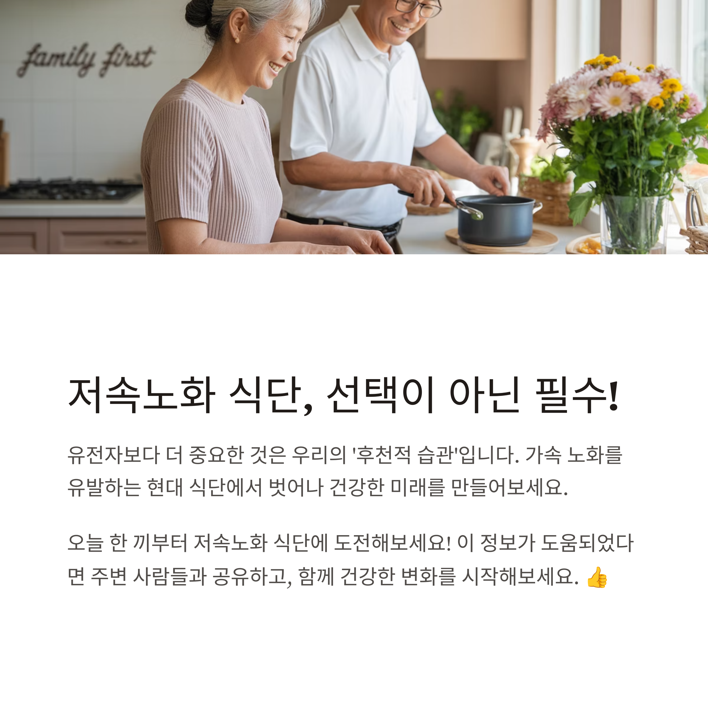 저속노화 식단은 단순히 늙지 않기 위한 방법이 아니라, 삶의 질을 높이기 위한 중요한 도구입니다. 이를 통해 건강 수명을 연장하고, 하루하루를 더 활기차고 가치 있게 살 수 있습니다. 식단의 작은 변화가 만성질환 예방과 신체활력 증진에 어떤 긍정적인 영향을 줄 수 있는지를 체계적으로 이해하고 꾸준히 실천하는 것이 중요해요. 이제 직접 실천할 준비가 되셨나요? 여러분의 건강한 변화가 응원합니다.