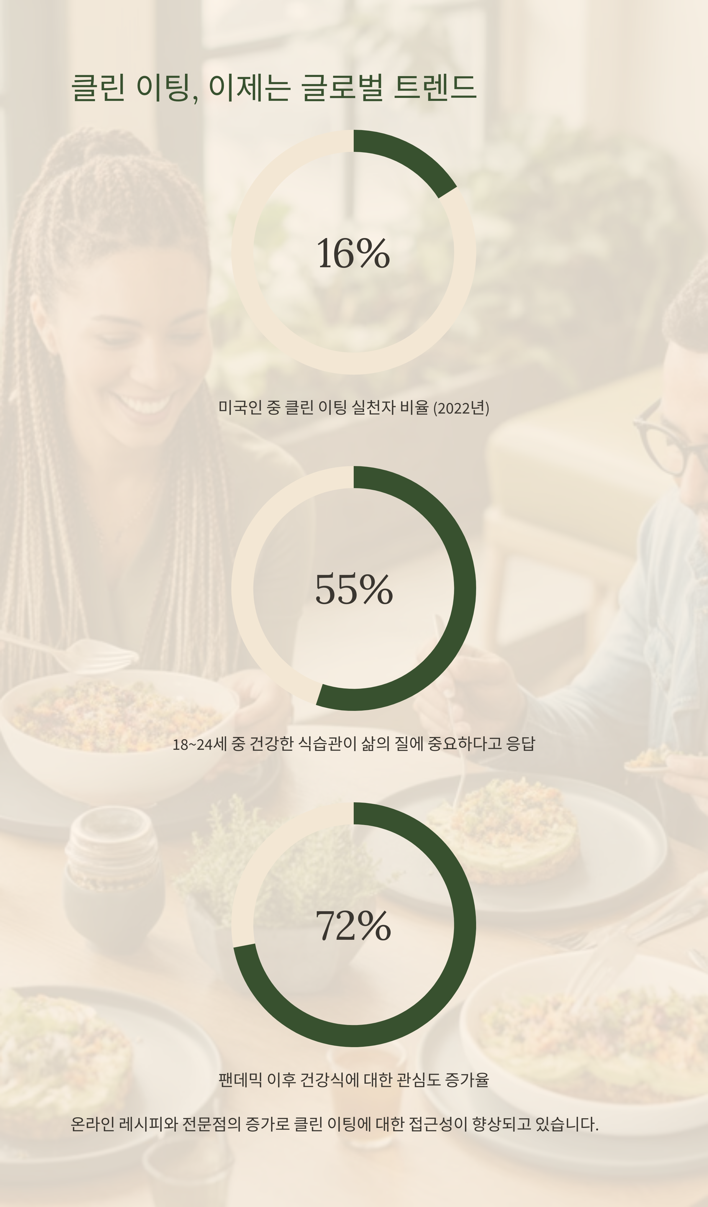 최근 몇 년 동안, 클린 이팅에 대한 관심이 크게 증가하고 있습니다. 이는 단순한 유행이 아니라 건강을 중시하는 현대인의 새로운 트렌드로 자리 잡고 있죠. 특히 무첨가, 저당, 비건 옵션을 갖춘 식품 시장이 급성장하고 있습니다. 다양한 연령층에서 클린 이팅을 실천하고 있는데, 2030 여성과 5060 남성 사이에서는 특히 인기가 높습니다. 표에서는 클린 이팅 관련 시장 변화와 소비자 행동 변화를 보여줍니다.